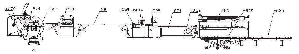 生產線主要由上料小車、開卷機、校平機、送料機構、剪板輸送裝置、堆垛裝置等組成。